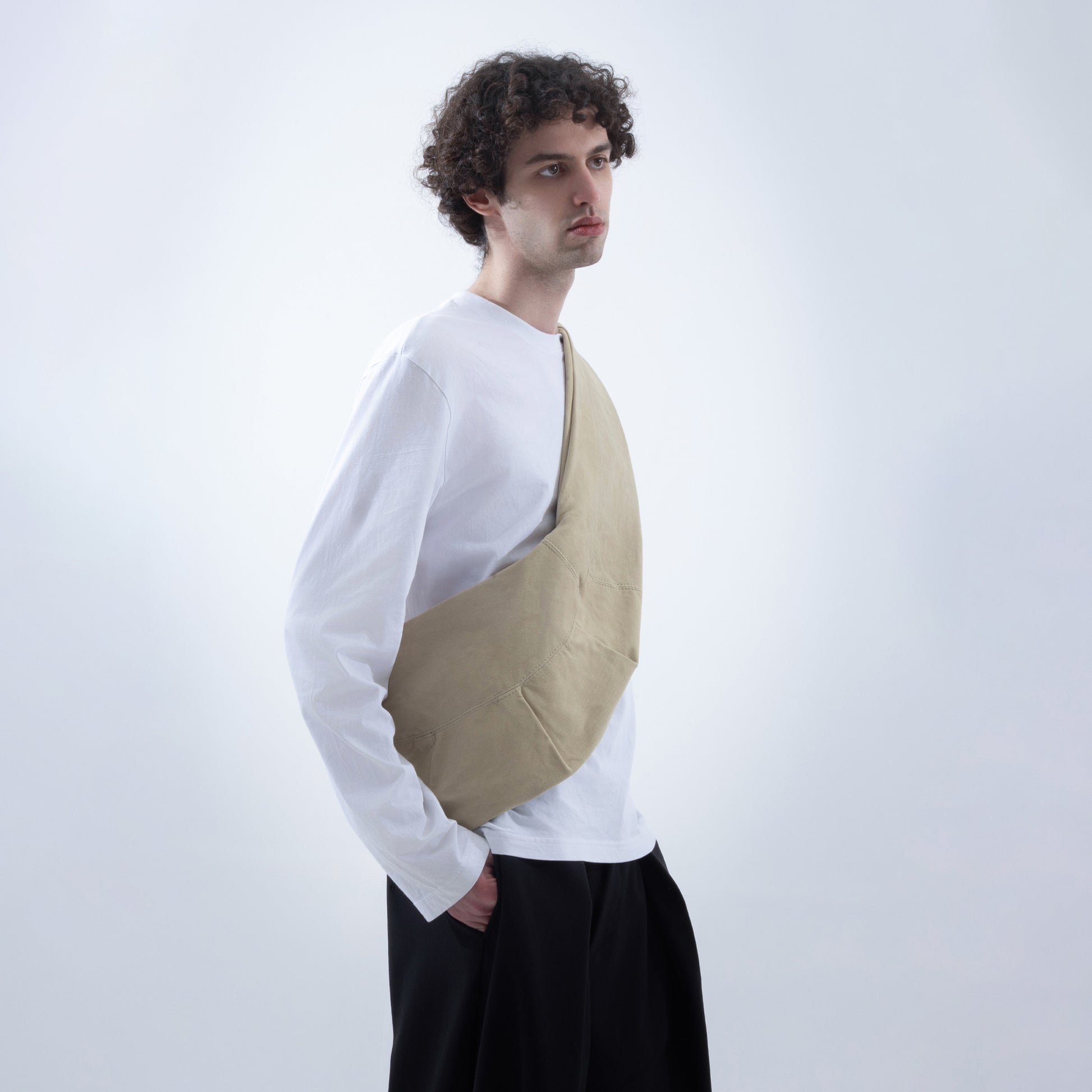 Soft sling bag in a beige shade. A light, soft color with warm undertones that creates a calm, balanced look and pairs naturally with neutral and earthy tones. This bag with a rounded silhouette that sits comfortably on the shoulder without restricting movement. Compact yet spacious enough for everyday essentials, featuring a structured form, soft beige tone, and a wide strap designed for comfortable, well-balanced wear.