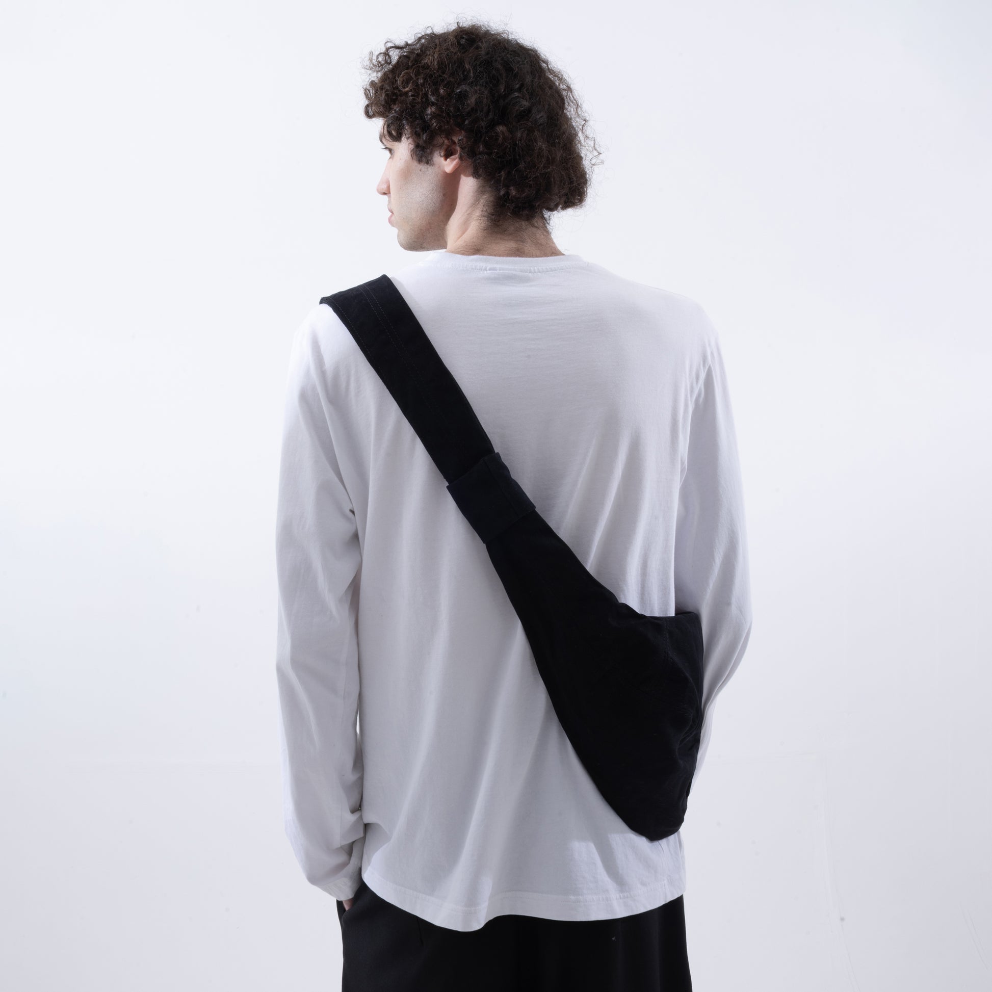 Soft sling bag in classic black. A clean, timeless color that looks structured and confident, effortlessly fitting into both casual and more polished looks. This bag with a rounded silhouette that sits comfortably on the shoulder without restricting movement. Compact yet spacious enough for everyday essentials, featuring a structured form, deep black tone, and a wide strap designed for comfortable, well-balanced wear.